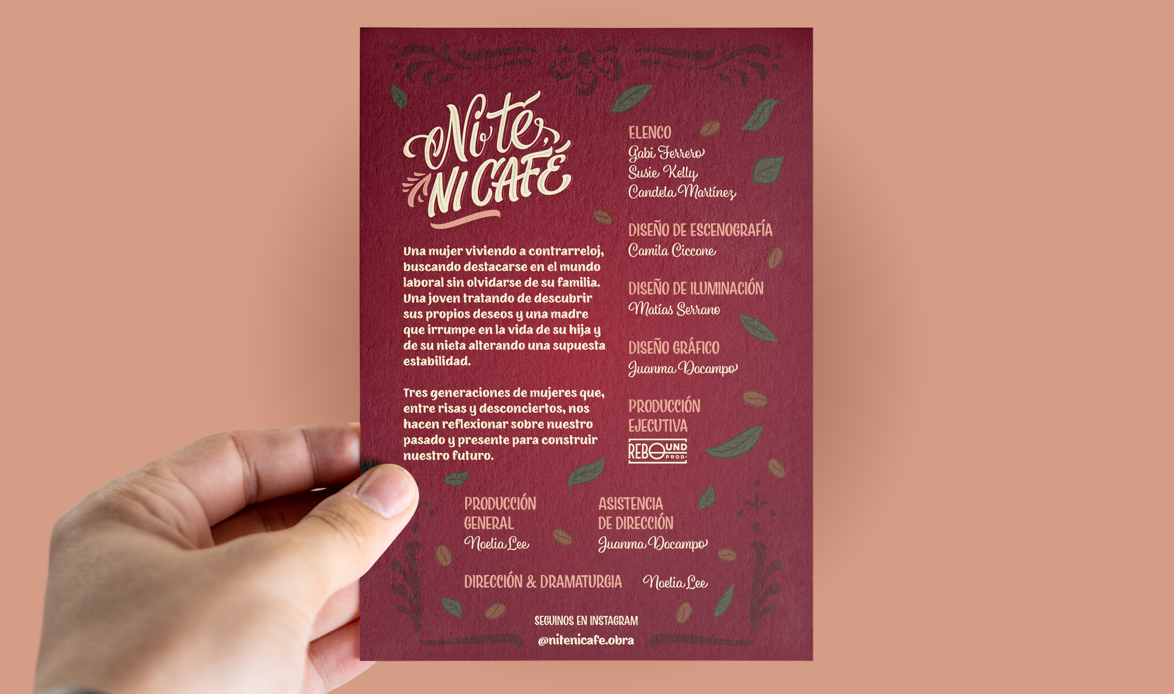 El proceso comenzó con bocetos a mano del lettering, entendiendo que la letra debía funcionar como la voz emocional de la obra. Luego aparecieron las ilustraciones de las tazas, objetos cotidianos presentes en escena que funcionan como metáfora de cada personaje. La composición se completó con texturas, ornamentos y detalles gráficos inspirados en lo doméstico y lo cotidiano.