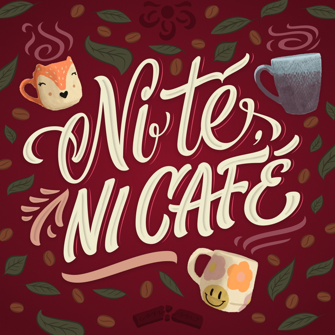 El lettering del título combina dos estilos distintos pero complementarios: un trazo más script para “Ni té” y uno más gestual y enérgico para “Ni café”. Esta diferencia remite simbólicamente a los universos que cada bebida representa dentro de la historia. La paleta de colores cálidos, las texturas suaves y los elementos ornamentales refuerzan la sensación de hogar y cercanía.